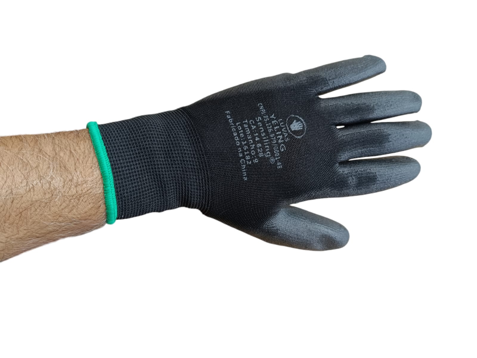 Luva de segurança confeccionada em fibras sintéticas, revestimento da face palmar e ponta dos dedos em poliuretano (PU), punho com inserções de fibras elásticas e acabamento em fibras sintéticas.